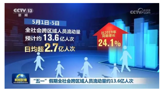 昨日,央視網(wǎng)消息稱,5月1日—5日,全社會跨區(qū)域人員流動(dòng)量預(yù)計(jì)約13.6億人次,日均超2.7億人次,比2019年同期增長24.1%。
