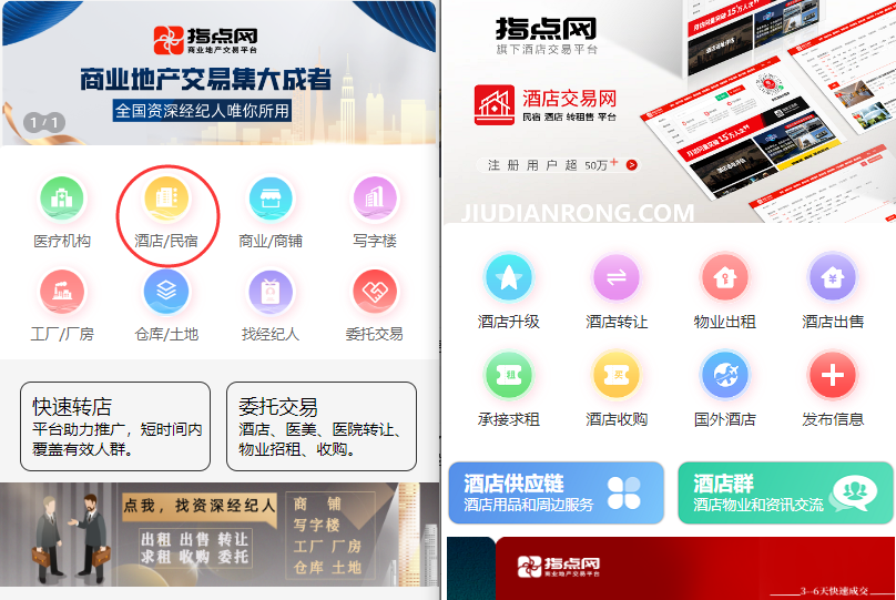 指點(diǎn)網(wǎng)旗下酒店交易網(wǎng)是國內(nèi)最大的酒店轉(zhuǎn)讓物業(yè)交易平臺,注冊用戶超50萬。平臺致力于提供國內(nèi)外酒店轉(zhuǎn)讓、酒店物業(yè)招租、酒店資產(chǎn)出售、酒店周邊產(chǎn)品與服務(wù)信息等綜合服務(wù),打造真實(shí)有效的酒店交易平臺,已是酒店行業(yè)必用平臺之一。
