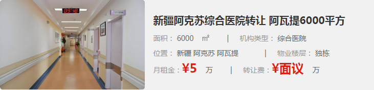 阿克蘇地區(qū)醫(yī)院,樓有6層帶電梯,總投資1200萬, 2021年開設(shè),因疫情期間裝修延誤,于23年8月開業(yè),設(shè)立內(nèi)科,外科,婦科,中醫(yī)科,理療科,皮膚科,口腔科,床位批49張, (可以批99張)。 全縣人口30萬,醫(yī)保在6月份可以下來。裝修布格都很好,設(shè)備有DR ,彩超兩個(gè),化驗(yàn)室、手術(shù)室、治療室的儀器齊全。因無心經(jīng)營,現(xiàn)折價(jià)轉(zhuǎn)讓,有意者請聯(lián)系,中介勿擾