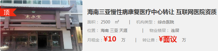 海南三亞慢性病康復(fù)醫(yī)療中心轉(zhuǎn)讓,醫(yī)院位于市中心。于2019年10月經(jīng)海南省衛(wèi)健委審批成立(第二名稱互聯(lián)網(wǎng)醫(yī)院)。該醫(yī)院是一家集醫(yī)療、康復(fù)、養(yǎng)生、保健、慢病管理、醫(yī)養(yǎng)為一體的慢性病康復(fù)醫(yī)療中心。該中心借助線下實體醫(yī)療服務(wù)及線上互聯(lián)網(wǎng)信息化管理技術(shù)平臺,為國內(nèi)外慢性病患者提供遠程診療服務(wù)。規(guī)模:面積約2500平方米左右,房租120萬/年。