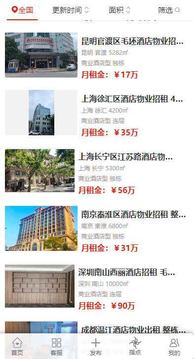 在上海普陀區(qū),一家商業(yè)酒店型物業(yè)以2.6元/平方米/天的租金出租,面積達(dá)8000平方米。昆明官渡區(qū)的一家毛坯酒店物業(yè)則以17萬(wàn)元的月租金招租,可出售,面積為5282平方米。南京秦淮區(qū)的一家商業(yè)酒店型物業(yè)以31萬(wàn)元的月租金招租,面積為6800平方米。