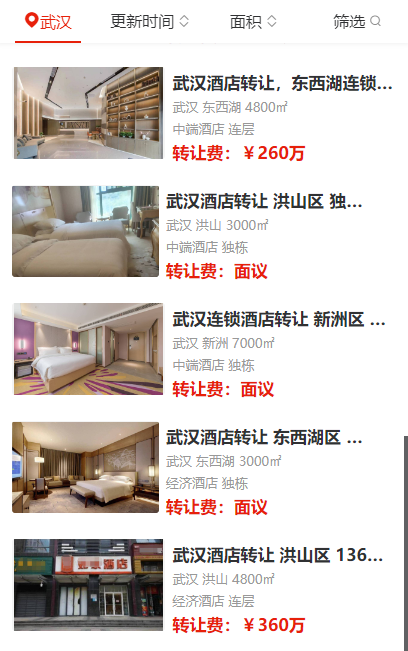 此外,青山區(qū)的一家經(jīng)濟型酒店擁有104間房,以25.6163萬元的月租金和700萬元的轉(zhuǎn)讓費尋找新業(yè)主。而蔡甸區(qū)的一家中端酒店,擁有105間客房,是區(qū)內(nèi)罕見的大規(guī)模酒店轉(zhuǎn)讓項目,其13000平方米的使用面積以及1500萬元的轉(zhuǎn)讓費,顯示出其巨大的商業(yè)潛力。