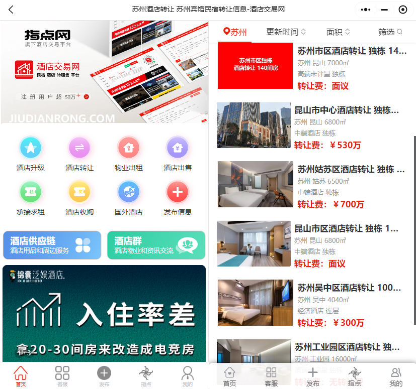 指點網(wǎng)旗下酒店交易網(wǎng)是國內(nèi)最大的酒店轉(zhuǎn)讓物業(yè)交易平臺,注冊用戶超50萬。平臺致力于提供國內(nèi)外酒店轉(zhuǎn)讓、酒店物業(yè)招租、酒店資產(chǎn)出售、酒店周邊產(chǎn)品與服務信息等綜合服務,打造真實有效的酒店交易平臺,已是酒店行業(yè)必用平臺之一。
