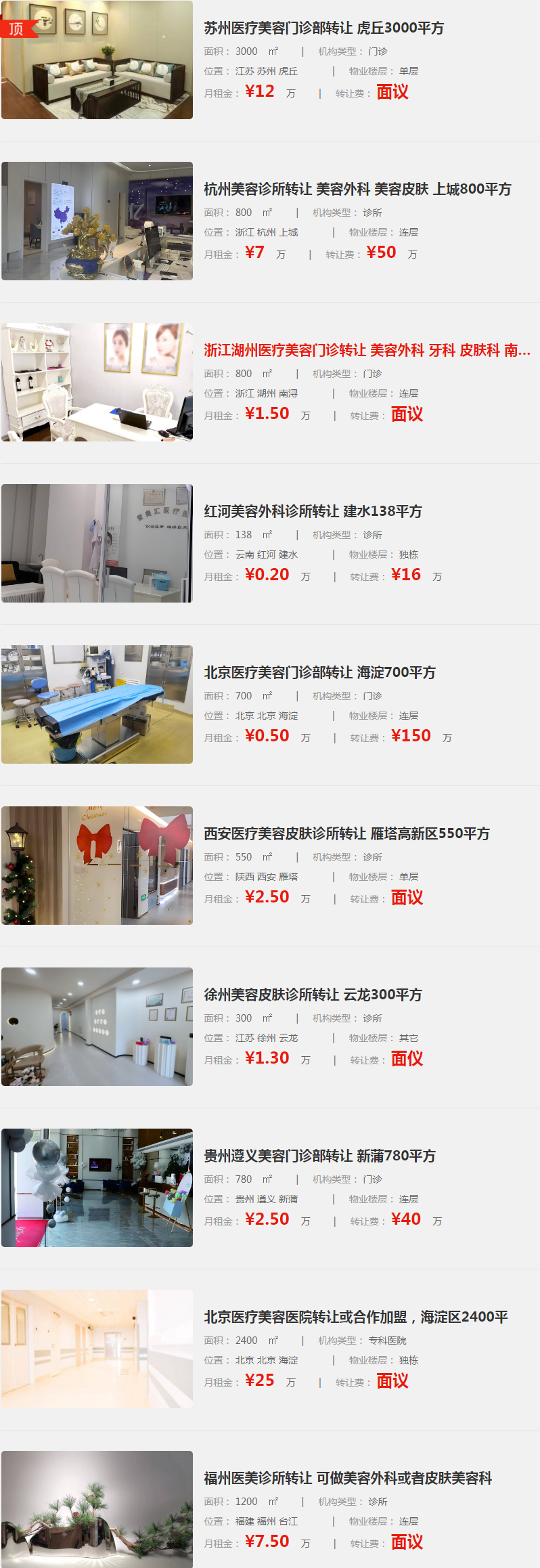 上海浦東醫(yī)療美容門(mén)診部:面積597㎡,轉(zhuǎn)讓費(fèi)用650萬(wàn),月租金15萬(wàn),剩余租期10年,設(shè)有醫(yī)療美容科、美容外科、美容牙科等多個(gè)科室。