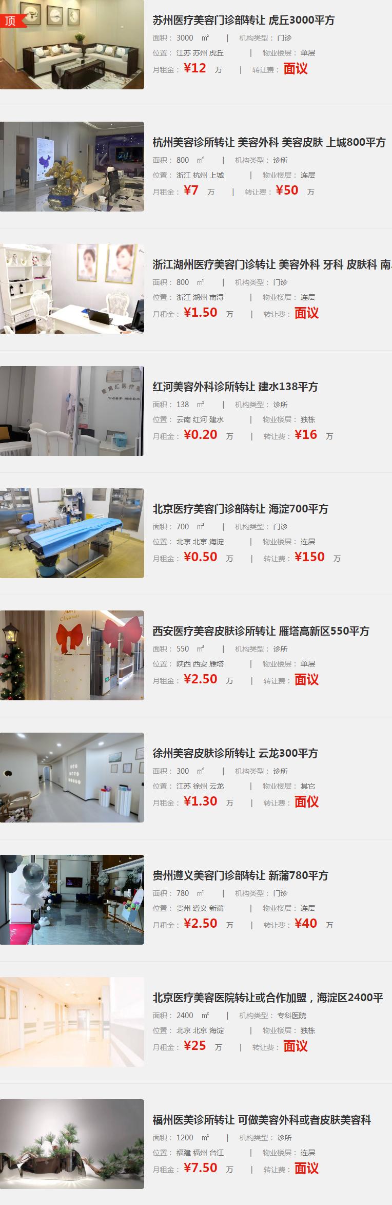 上海浦東醫(yī)療美容門診部:面積597㎡,轉(zhuǎn)讓費(fèi)用650萬(wàn),月租金15萬(wàn),剩余租期10年,設(shè)有醫(yī)療美容科、美容外科、美容牙科等多個(gè)科室。