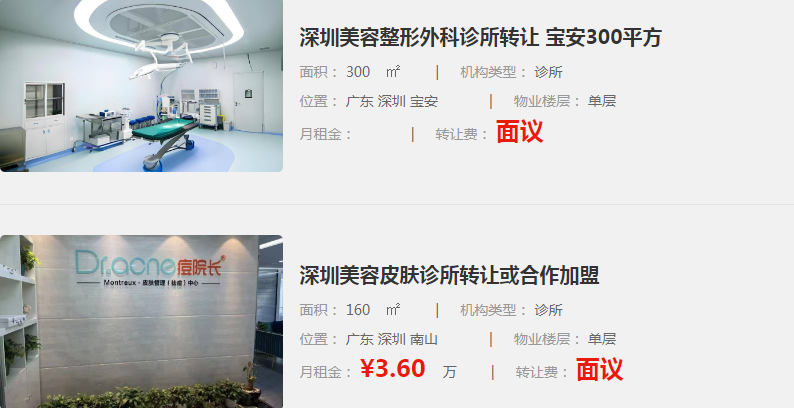 案例二:深圳南山某醫(yī)療美容診所轉(zhuǎn)讓,面積約260平方米,設(shè)有美容皮膚科和整形外科兩個資質(zhì),全新裝修,位于高檔社區(qū)內(nèi),商鋪位置顯眼,設(shè)施齊全。