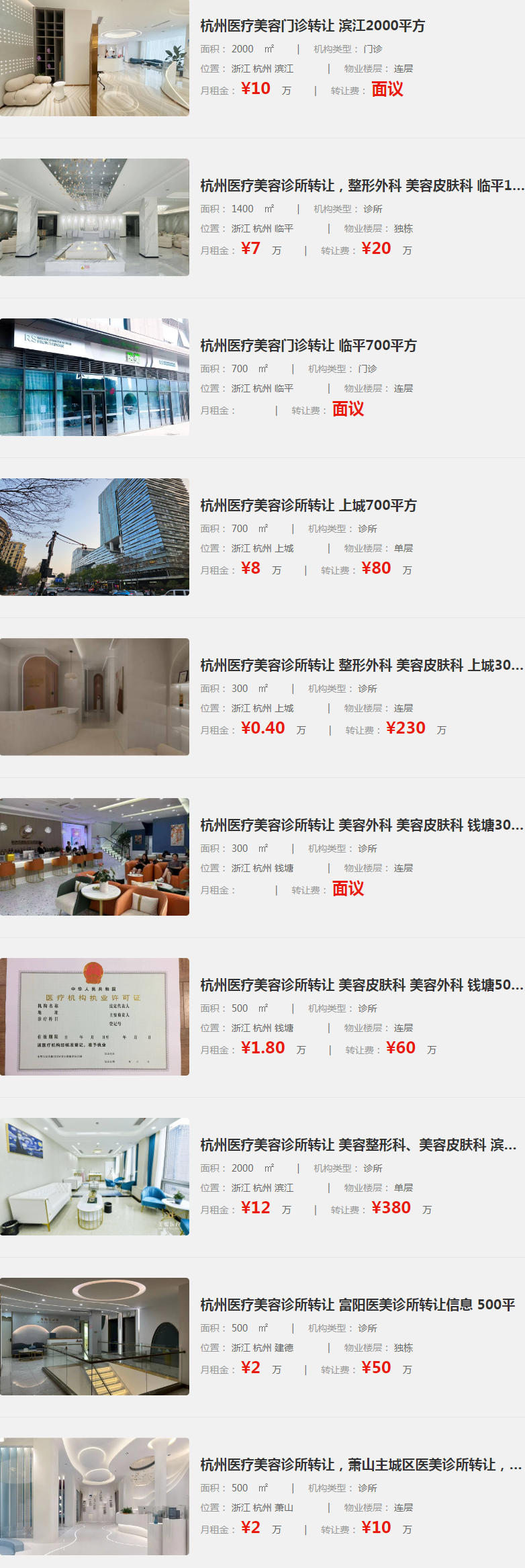 在指點網(wǎng)上,杭州地區(qū)的美容整形醫(yī)院轉(zhuǎn)讓信息通常包括以下幾個方面:
