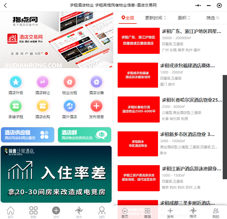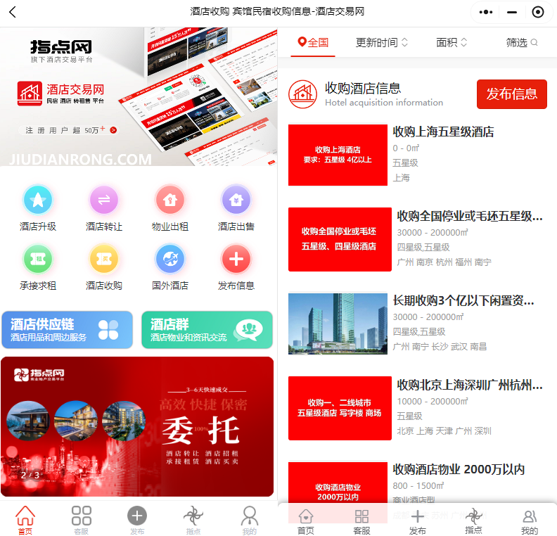 指點(diǎn)網(wǎng)旗下酒店交易網(wǎng)是國內(nèi)最大的酒店轉(zhuǎn)讓物業(yè)交易平臺,注冊用戶超50萬。平臺致力于提供國內(nèi)外酒店轉(zhuǎn)讓、酒店物業(yè)招租、酒店資產(chǎn)出售、酒店周邊產(chǎn)品與服務(wù)信息等綜合服務(wù),平臺堅守:自由交易,不收傭金的態(tài)度,打造真實(shí)有效的酒店交易平臺,已是酒店行業(yè)必用平臺之一。