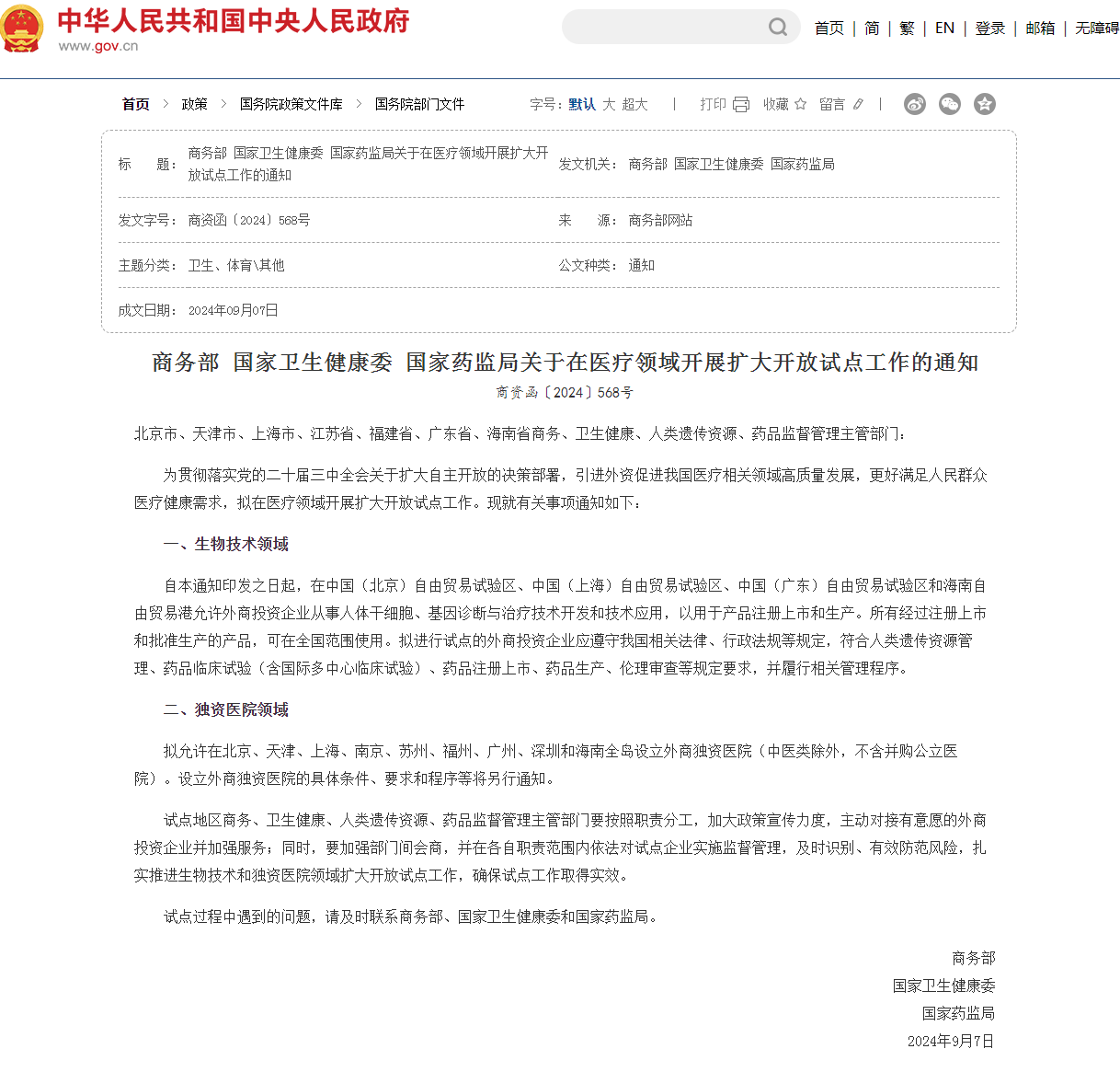 商務部 國家衛(wèi)生健康委 國家藥監(jiān)局關于在醫(yī)療領域開展擴大開放試點工作的通知
