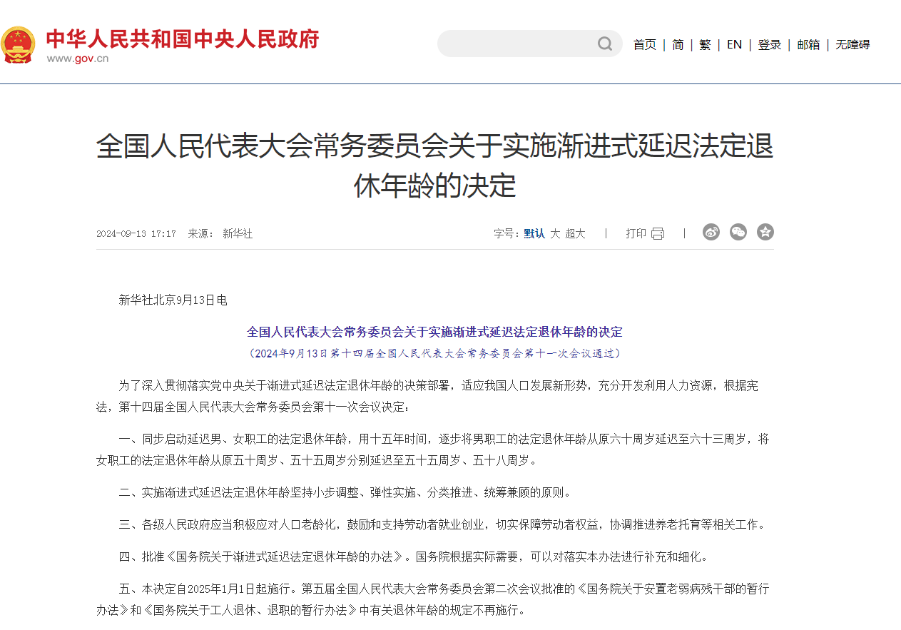 全國人民代表大會常務(wù)委員會關(guān)于實施漸進(jìn)式延遲法定退休年齡的決定