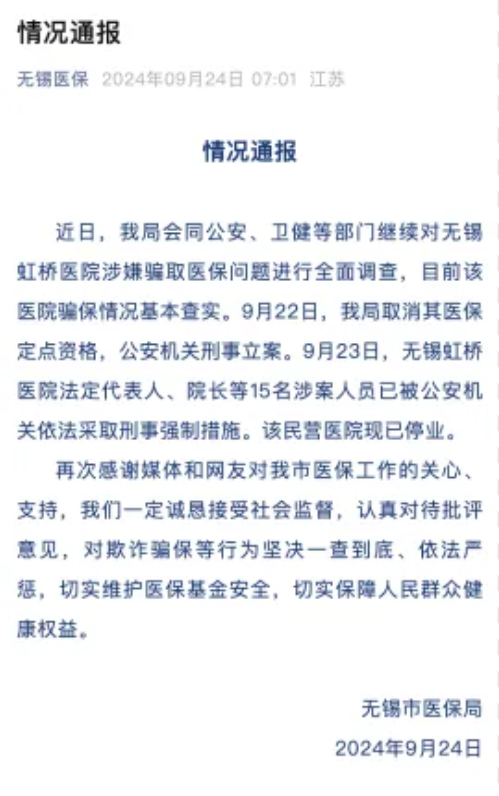 9月24日,無錫市醫(yī)保局發(fā)布情況通報,其會同公安、衛(wèi)健等部門繼續(xù)對無錫虹橋醫(yī)院涉嫌騙取醫(yī)保問題進行全面調(diào)查,目前該醫(yī)院騙保情況基本查實。9月22日,無錫市醫(yī)保局取消該醫(yī)院的醫(yī)保定點資格,公安機關(guān)刑事立案。9月23日,無錫虹橋醫(yī)院法定代表人、院長等15名涉案人員已被公安機關(guān)依法采取刑事強制措施。該民營醫(yī)院現(xiàn)已停業(yè)。