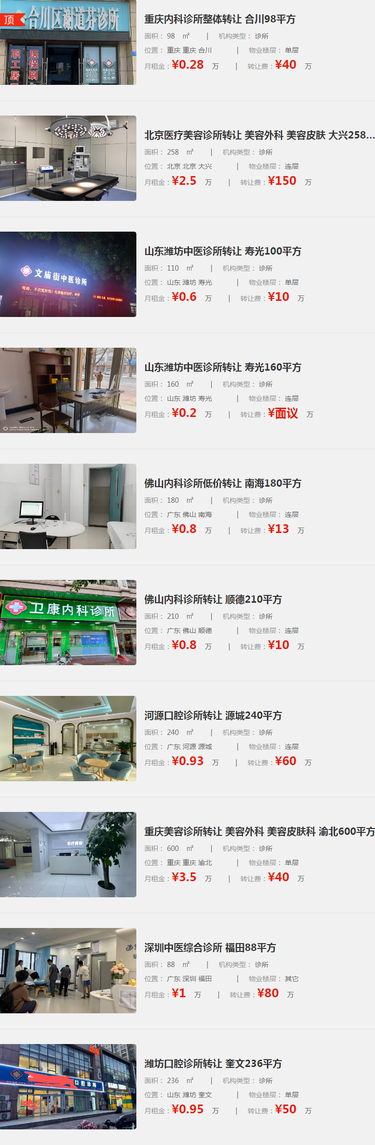 從山城重慶到首都北京,從山東濰坊到廣東佛山、深圳,我們覆蓋了全國多個熱門城市的診所轉(zhuǎn)讓信息。無論是98平米的內(nèi)科診所,還是600平米集美容外科、美容皮膚科于一體的大型美容診所,多樣化的面積與類型,滿足不同醫(yī)療機構(gòu)的經(jīng)營需求。特別是山東濰坊的兩家中醫(yī)診所,以其獨特的中醫(yī)文化魅力和合理的租金,成為中醫(yī)愛好者的優(yōu)選。