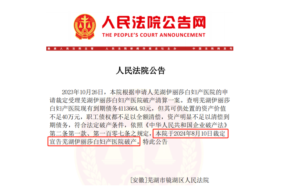 9月13日,人民法院公告網(wǎng)更新了一則破產(chǎn)文書。其中顯示:蕪湖市鏡湖區(qū)人民法院于2024年8月10日裁定宣告蕪湖伊麗莎白婦產(chǎn)醫(yī)院破產(chǎn)。
