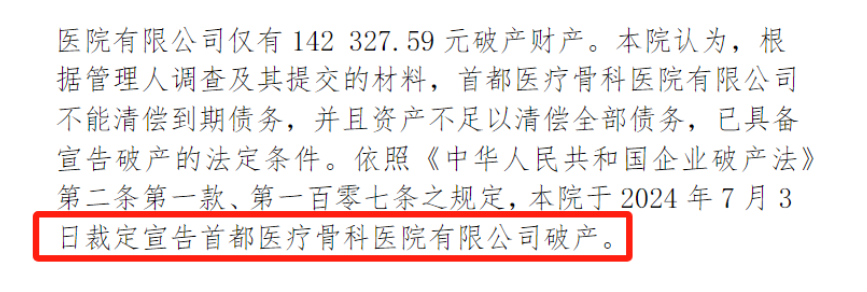 7月3日,全國企業(yè)破產(chǎn)重整案件信息網(wǎng)發(fā)布公告,裁定宣告首都醫(yī)療骨科醫(yī)院有限公司破產(chǎn)。