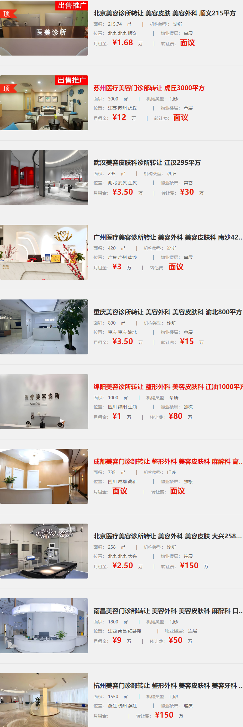以下是指點提供整理部分醫(yī)療美容診所、美容門診、美容醫(yī)院、整形醫(yī)院轉讓信息