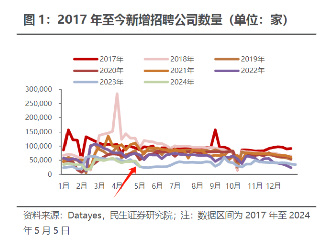 2024年10月5日為止一周,國(guó)內(nèi)新增招聘公司數(shù)量29000個(gè),恢復(fù)至22年同期的41.79%,恢復(fù)至19年同期的56.41%,新增招聘公司數(shù)量暫未恢復(fù)至2022年和2019年同期水平。
