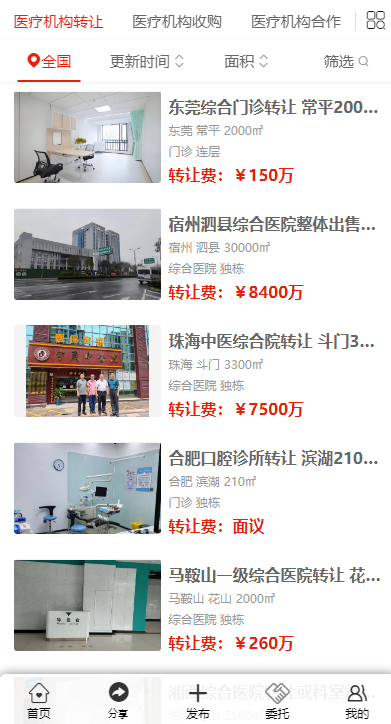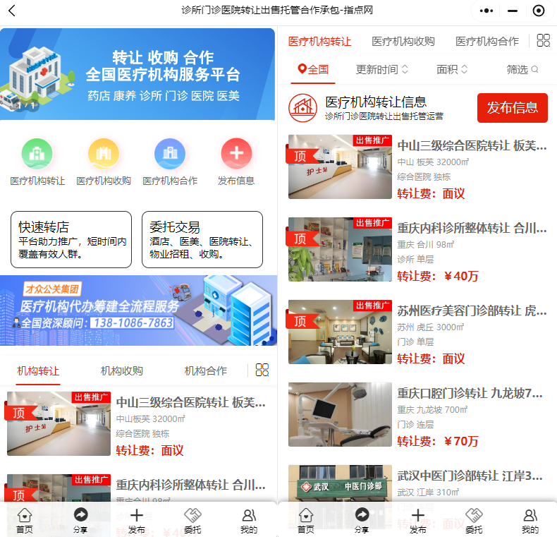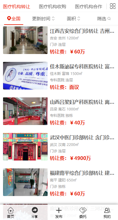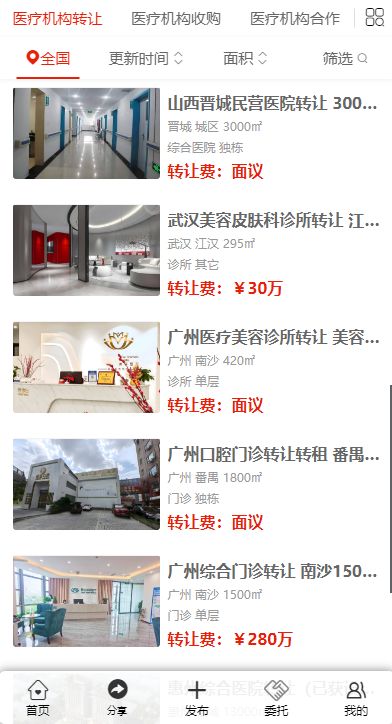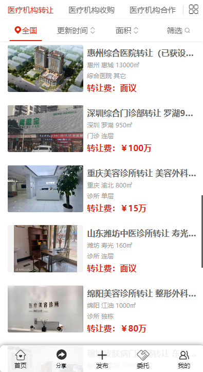 該平臺(tái)上展示了來自全國(guó)各地豐富多樣的醫(yī)療機(jī)構(gòu)轉(zhuǎn)讓信息。例如在重慶九龍坡,有一家面積為 700㎡的口腔門診尋求轉(zhuǎn)讓,其物業(yè)樓層為連層,月租金 2.8 萬(wàn),轉(zhuǎn)讓費(fèi) 70 萬(wàn)。湖北武漢江岸區(qū)的一家中醫(yī)門診部也在轉(zhuǎn)讓之列,面積 310㎡,同樣位于連層物業(yè),轉(zhuǎn)讓費(fèi)面議。