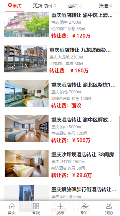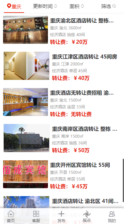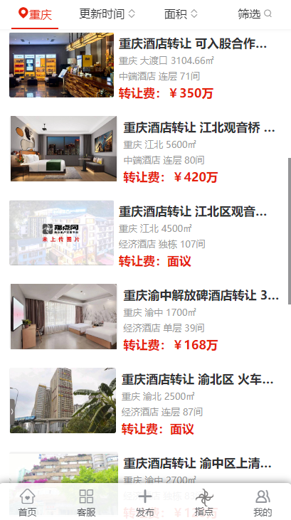 在重慶的多個(gè)區(qū)域,包括渝北區(qū)、酉陽(yáng)區(qū)、江北區(qū)、渝中區(qū)、大渡口區(qū)、九龍坡區(qū)、沙坪壩區(qū)、南岸區(qū)、永川區(qū)以及萬州區(qū)等,都出現(xiàn)了不同規(guī)模和類型的酒店轉(zhuǎn)讓信息。這些酒店涵蓋了經(jīng)濟(jì)酒店、中端酒店以及高端未評(píng)星酒店,規(guī)模從面積 1500㎡到 7000㎡不等,房間數(shù)量從 31 間到 150 間各異。