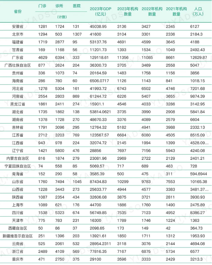 以上為全國31個省份直轄市自治區(qū)截至到2024年9月30日的口腔醫(yī)療機(jī)構(gòu)在工商注冊和經(jīng)營狀態(tài)的機(jī)構(gòu)數(shù)量,以及2023,2022,2021的過往三年數(shù)據(jù)對比統(tǒng)計表。