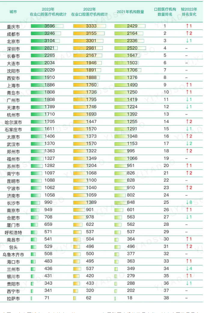 全國38個主要城市(含直轄市)的2021-2023 年口腔醫(yī)療機(jī)構(gòu)數(shù)量變化。其中全國數(shù)量最多的是重慶市 3596家,其次是成都市 3246家,之后是北京和深圳。去年負(fù)增長的城市包括:北京、深圳、武漢、福州、昆明、濟(jì)南、長沙、合肥、??凇⑻m州、貴陽。