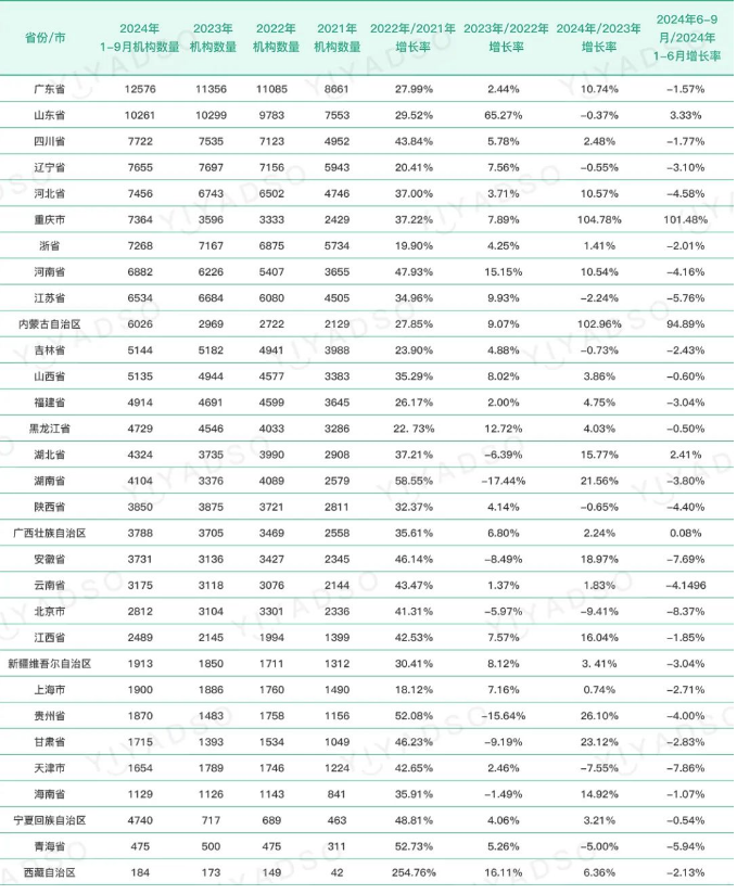2,目前全國機(jī)構(gòu)數(shù)量最多的省份還是廣東省,截至到2024年9月30日總數(shù)量為12576家,已經(jīng)連續(xù)3年正增長狀態(tài)。其次是山東省總數(shù)為10261家,本年度呈現(xiàn)略微負(fù)增長。第三名為四川省總數(shù)7722家也是連續(xù)三年正增長。