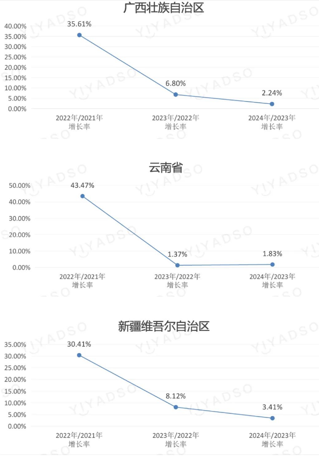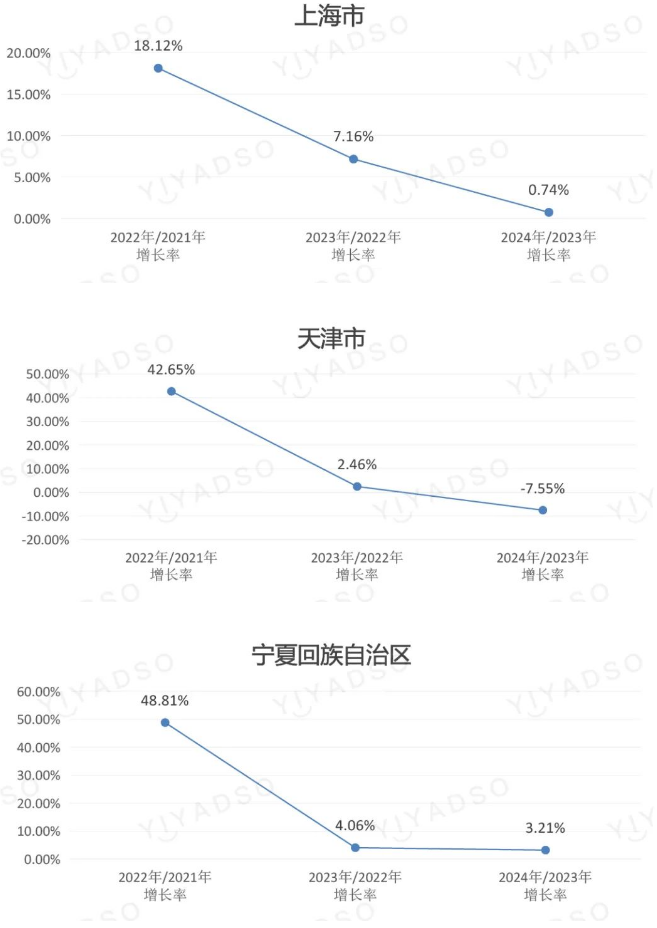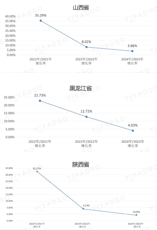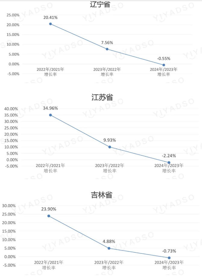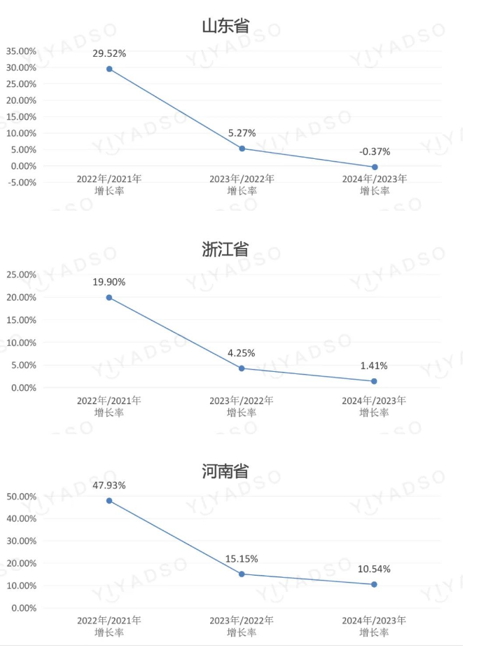 全國呈現(xiàn)增長變緩的省份直轄市自治區(qū)包括:山東、浙江、河南、遼寧、江蘇、吉林、山西、黑龍江、陜西、廣西壯族自治區(qū)、云南省、新疆維吾爾自治區(qū)、上海、天津、寧夏回族自治區(qū)、青海、西藏自治區(qū)、其中截至到2024年9月底呈現(xiàn)負(fù)增長的是:山東、遼寧、吉林、江蘇、陜西、天津、青海。而河南省連續(xù)三年保持超過10%的增長。