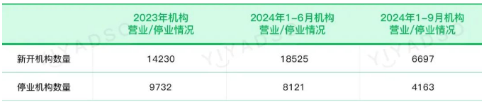 從以上統(tǒng)計數(shù)據(jù)上可以看出,2024年大部分新開機(jī)構(gòu)都集中在1-6月份上半年。而截至到2024年9月底無論是新開還是停業(yè)的機(jī)構(gòu)總數(shù)都遠(yuǎn)遠(yuǎn)超出2023年整個年度。