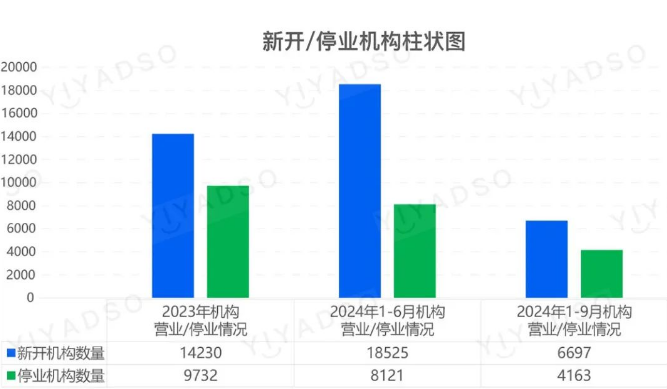 1,2023年,2024年1-6月,6-9月的新開機(jī)構(gòu)和停業(yè)機(jī)構(gòu)的數(shù)量統(tǒng)計: