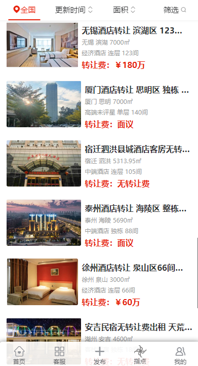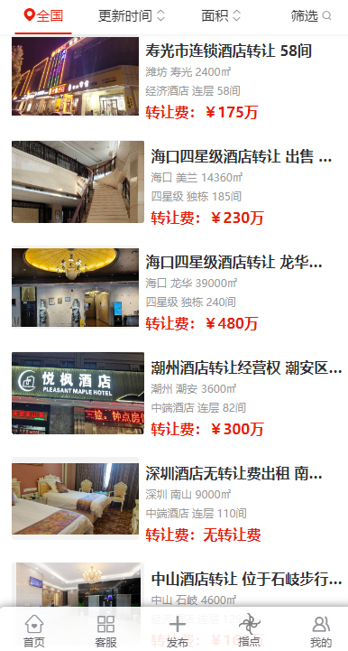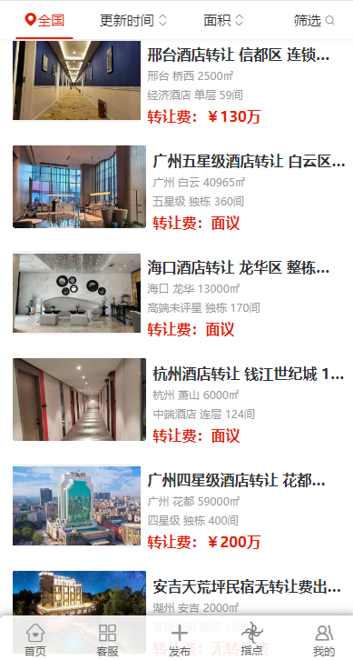 從平臺數(shù)據(jù)來看,涉及的酒店遍布全國各地,從繁華的一線城市如北京、上海、廣州、深圳,到各個省會城市以及經(jīng)濟發(fā)展活躍的二三線城市,規(guī)模和類型各異。轉(zhuǎn)讓的酒店面積從 1000㎡到 59000㎡不等,房間數(shù)量也從 24 間到 400 間各有不同,涵蓋了經(jīng)濟酒店、中端酒店、五星級酒店、公寓式酒店等多種類型,滿足了不同投資者的需求。