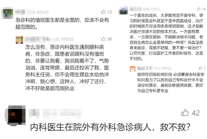 在醫(yī)療領(lǐng)域內(nèi),醫(yī)生的專業(yè)范圍與執(zhí)業(yè)行為之所以始終是社會關(guān)注的焦點,特別是在急診環(huán)境下醫(yī)生執(zhí)業(yè)行為是否超出注冊專業(yè)范圍的問題屢屢引發(fā)討論。在一篇《急診醫(yī)生看了幾名患者后,醫(yī)院被罰4.5萬!他們到底犯了什么錯?》文章下,網(wǎng)友們都各自表達了自己的想法和觀點:
