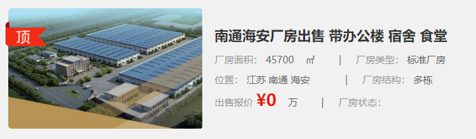 除海安之外,南通如東和海門也有優(yōu)質(zhì)廠房出售。如東有獨門獨院全新整層廠房出售,面積為 1500㎡,廠房類型為園區(qū)廠房,單層結(jié)構(gòu),出售報價 560 萬。海門則有 104 地塊國土雙證廠房出售,面積 270㎡,單層標(biāo)準(zhǔn)廠房,報價 30000 萬,且可分開出售;另有國土占地 30 畝的廠房,其中 15583.34㎡的多棟標(biāo)準(zhǔn)廠房可一半出售,報價 5143 萬。