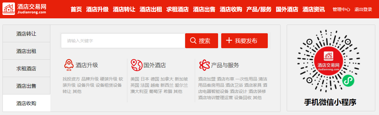 作為專業(yè)的酒店信息發(fā)布平臺,用戶可以在其酒店賓館類目下查找相關的轉(zhuǎn)讓、出租、出售信息,其優(yōu)勢是信息量大、覆蓋范圍廣,不同地區(qū)的用戶都能找到當?shù)氐木频贽D(zhuǎn)讓資源