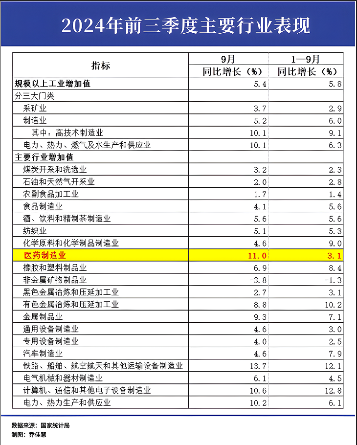 據(jù)國(guó)家統(tǒng)計(jì)局?jǐn)?shù)據(jù)顯示,9月,41個(gè)大類行業(yè)中有36個(gè)行業(yè)增加值保持同比增長(zhǎng),全國(guó)規(guī)模以上工業(yè)增加值同比增長(zhǎng)5.4%,增速較8月加快0.9個(gè)百分點(diǎn),在連續(xù)四個(gè)月回落后,實(shí)現(xiàn)回升。其中,醫(yī)藥制造業(yè)同比增長(zhǎng)達(dá)到11%。