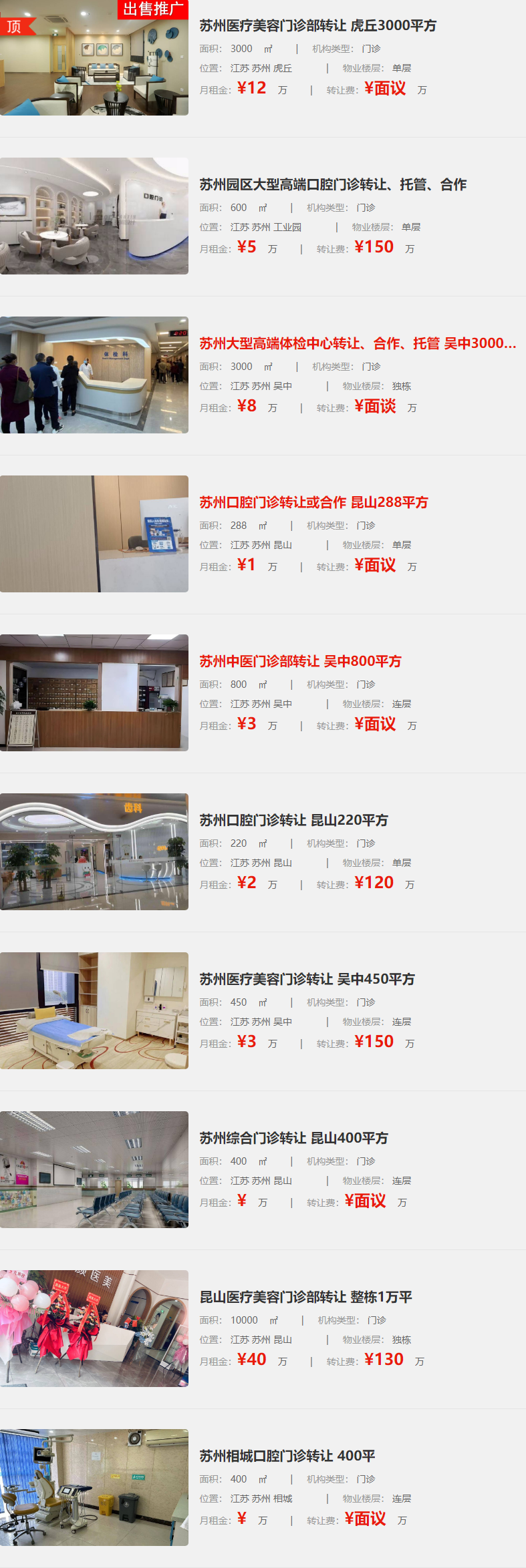 指點(diǎn)網(wǎng)轉(zhuǎn)讓平臺,作為專業(yè)的門診轉(zhuǎn)讓樞紐,具備諸多無可比擬的優(yōu)勢。首先,平臺匯聚了豐富多樣的門診資源。從虎丘 3000 平米的醫(yī)療美容門診部,到園區(qū) 600 平米的高端口腔門診;從吳中 3000 平米的大型高端體檢中心,到昆山不同規(guī)模的口腔、綜合及醫(yī)療美容門診,再到相城的口腔門診等,涵蓋了各種類型、各種規(guī)模、各個(gè)區(qū)域的門診轉(zhuǎn)讓信息。這使得無論是尋求特定類型門診的接手者,還是有廣泛投資意向的買家,都能在平臺上找到心儀的目標(biāo)。