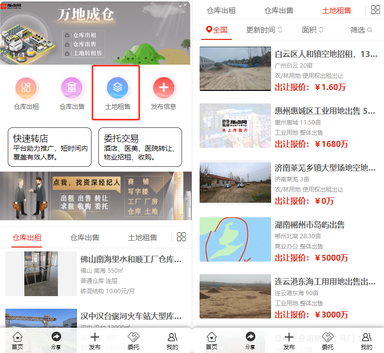 平臺(tái)簡(jiǎn)介:作為指點(diǎn)網(wǎng)旗下專(zhuān)注于土地交易的平臺(tái),為用戶提供全面的地皮租售信息,包括住宅用地、工業(yè)用地、商業(yè)用地、辦公用地、綜合用地、農(nóng)林用地以及倉(cāng)儲(chǔ)用地等。
