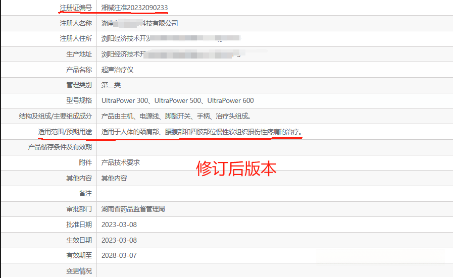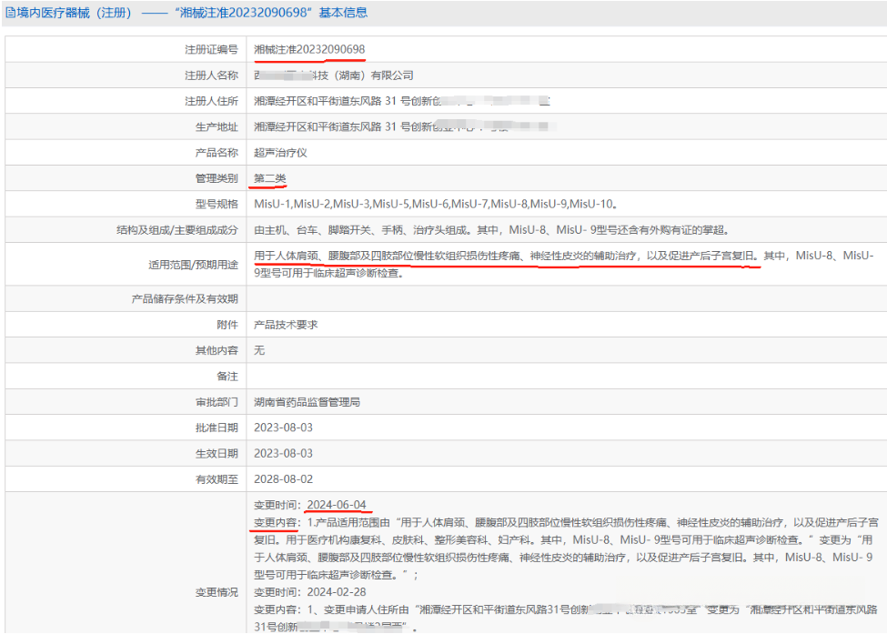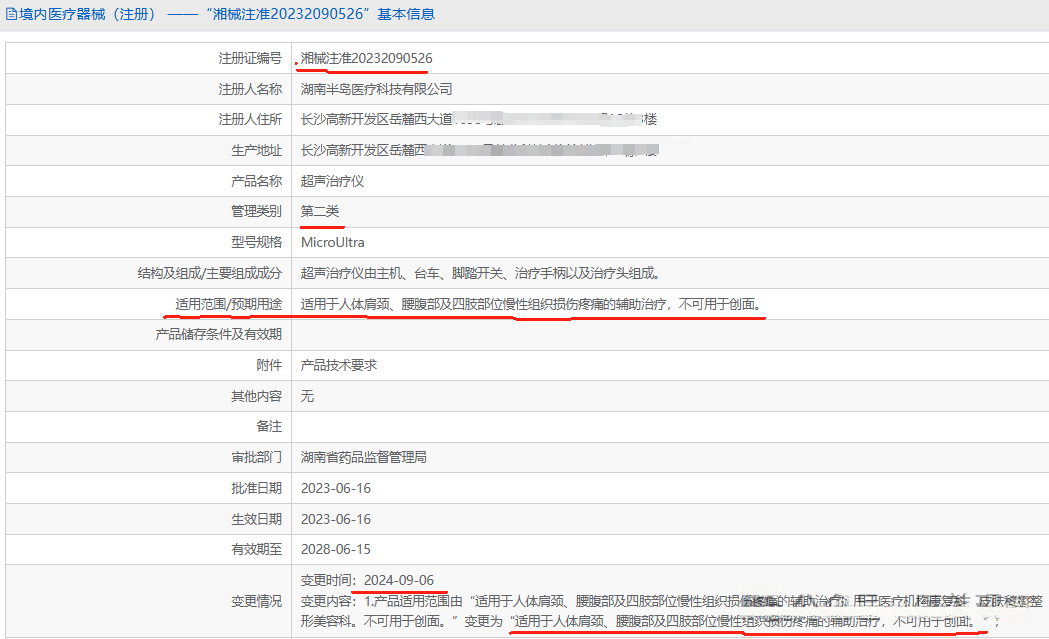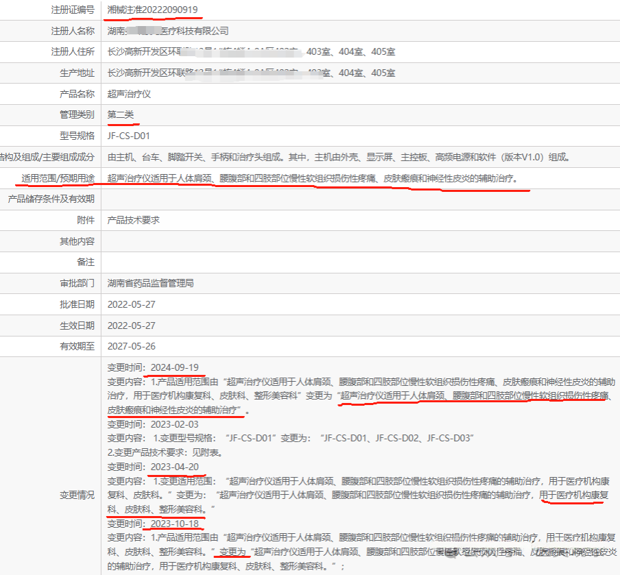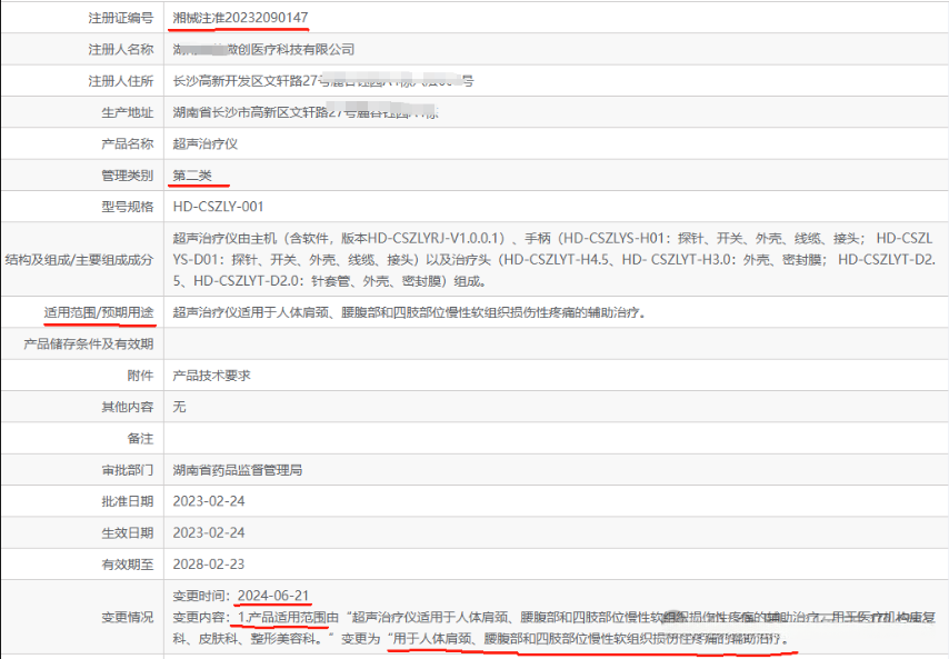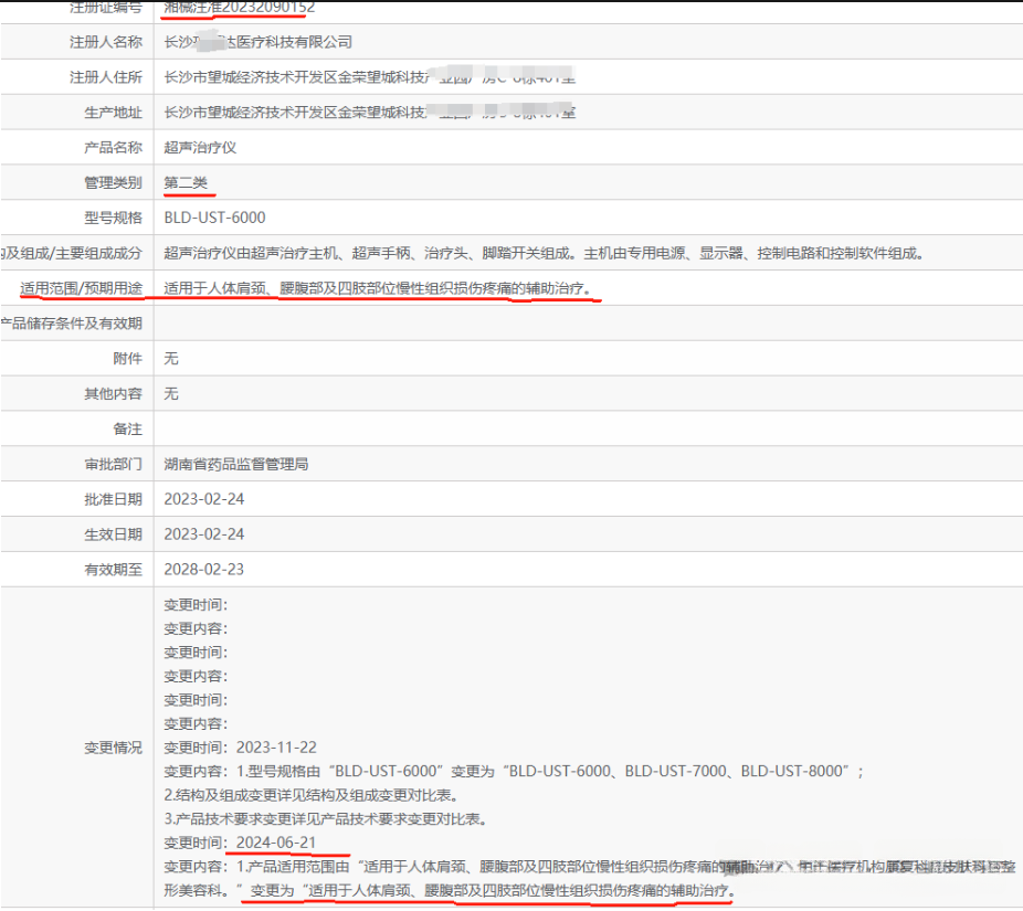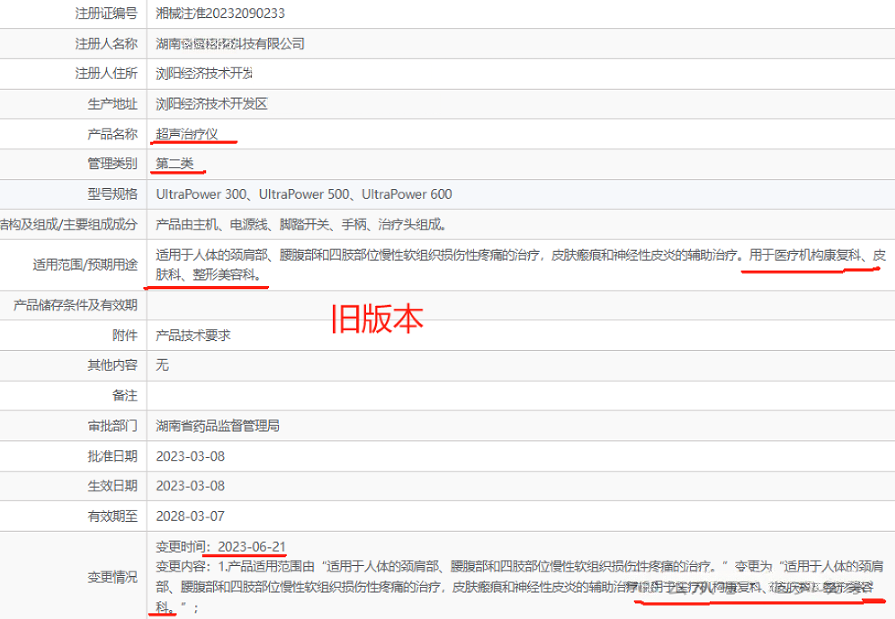 近期,國家藥品監(jiān)督管理局(NMPA)對湖南省內7家企業(yè)的超聲治療儀注冊證進行了重要調整,統(tǒng)一取消了這些設備原本適用于“醫(yī)療機構康復科、皮膚科、整形美容科、婦產科相關疾病的輔助治療”的標注,明確限定了其僅適用于“人體肩頸、腰腹部及四肢部位慢性組織損傷疼痛,皮膚瘢痕和神經性皮炎的輔助治療,以及促進產后子宮復舊”。通過此次修正后此產品基本定性為疾病治療。