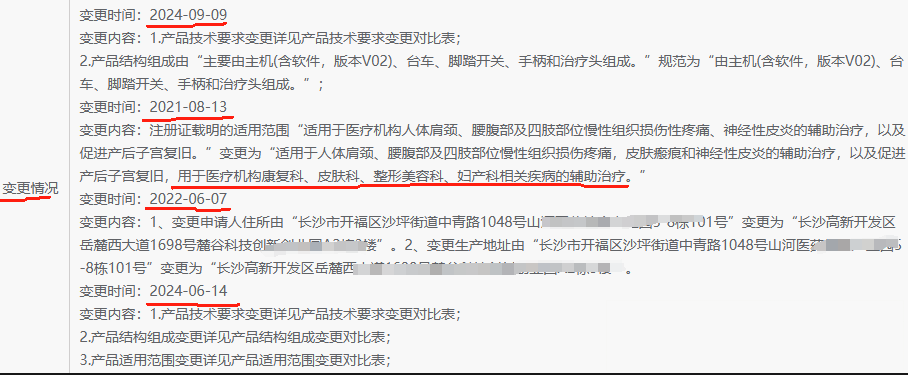 同時,根據變更情況查詢到,此設備是在2021年8月13日增加變更的內容,已經在市場上使用了超過三年時間,如果后續(xù)被定型“違規(guī)審批”所波及到的方面比較廣泛。