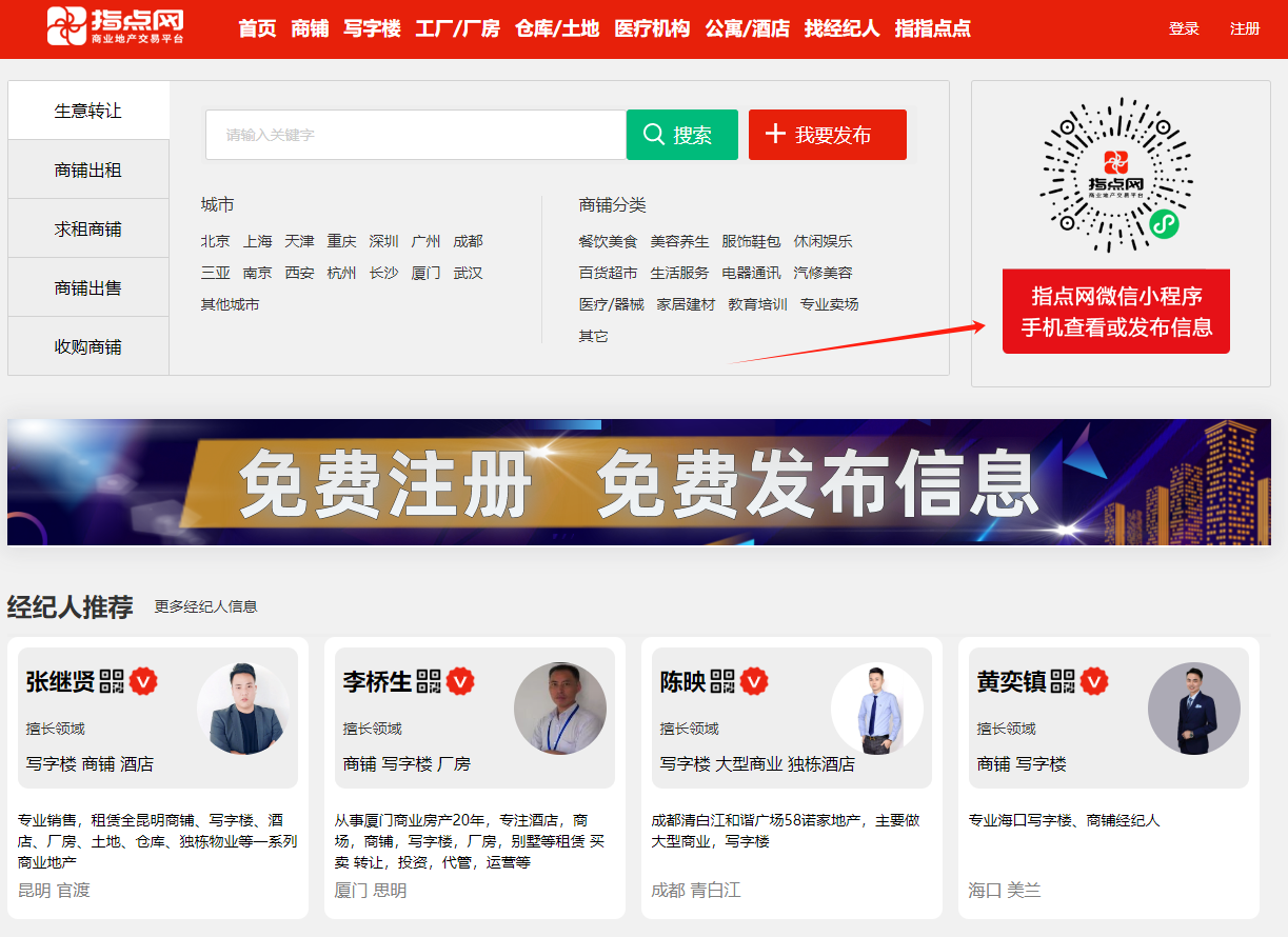 平臺簡介:指點(diǎn)網(wǎng)是專注于商業(yè)地產(chǎn)信息發(fā)布、展示與交易的專業(yè)垂直平臺,其商鋪出租出售板塊提供豐富的商鋪資源,涵蓋了各種類型和地段的商鋪,包括臨街商鋪、商業(yè)綜合體商鋪等.
