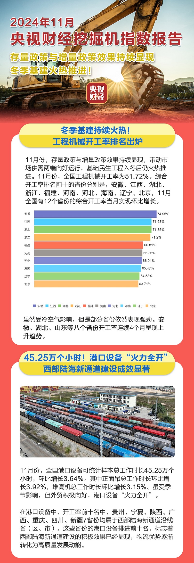 以安徽為例,作為長三角地區(qū)的重要省份之一,其在交通、能源等基礎(chǔ)設(shè)施建設(shè)方面持續(xù)發(fā)力。高速公路、鐵路等重大交通項(xiàng)目的不斷推進(jìn),不僅改善了區(qū)域交通條件,也為經(jīng)濟(jì)發(fā)展提供了有力支撐。同時(shí),安徽還積極推動(dòng)產(chǎn)業(yè)升級(jí)項(xiàng)目,各類工業(yè)園區(qū)的建設(shè)和企業(yè)的擴(kuò)產(chǎn)增效,使得工程機(jī)械的需求持續(xù)旺盛,開工率居高不下。