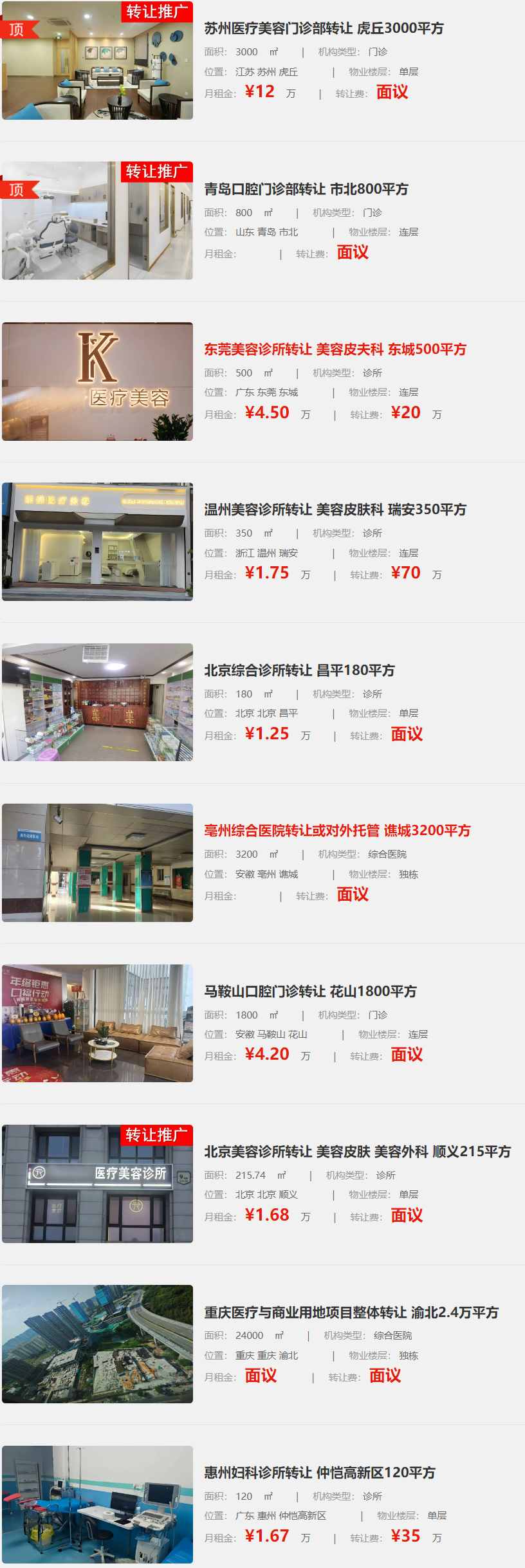 平臺(tái)提供包括綜合醫(yī)院、??漆t(yī)院(如口腔、眼科、婦產(chǎn)等)、診所等多種醫(yī)療機(jī)構(gòu)的轉(zhuǎn)讓信息,為用戶提供豐富的選擇。