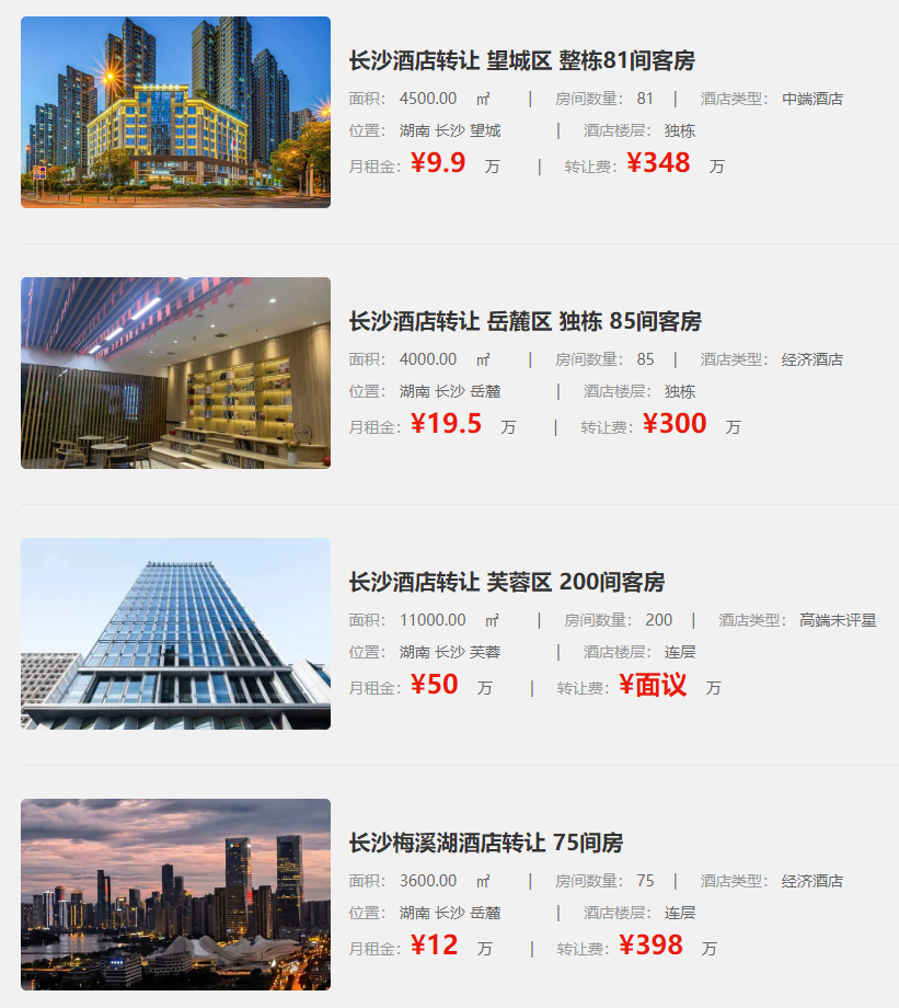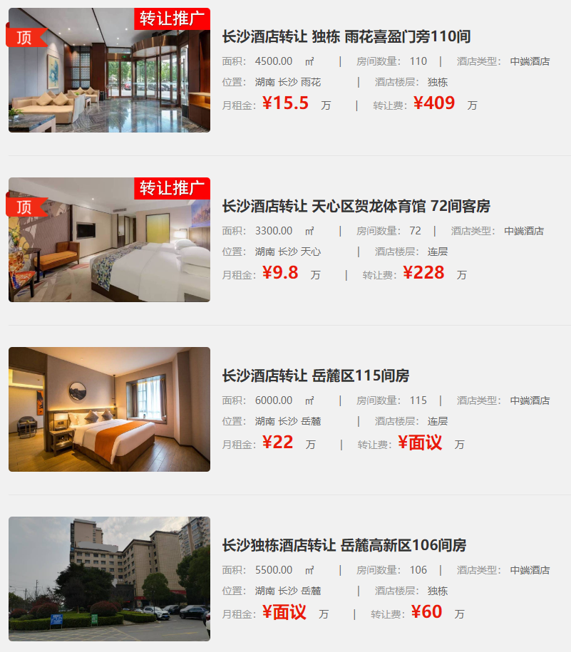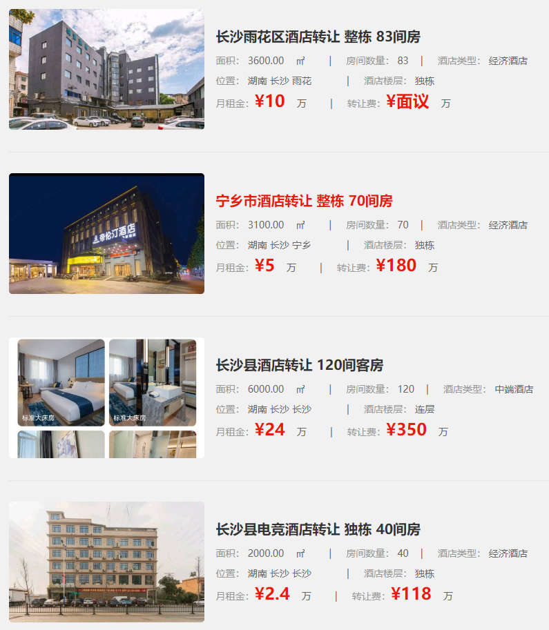 涉及費(fèi)用方面,月租金從長(zhǎng)沙縣電競(jìng)酒店的 2.4 萬(wàn)至芙蓉區(qū) 200 間客房酒店的 50 萬(wàn)不等;轉(zhuǎn)讓費(fèi)最低為岳麓高新區(qū)獨(dú)棟酒店的 60 萬(wàn),而最高的是岳麓區(qū) 133 間客房獨(dú)棟酒店的 690 萬(wàn),還有部分酒店轉(zhuǎn)讓費(fèi)面議。