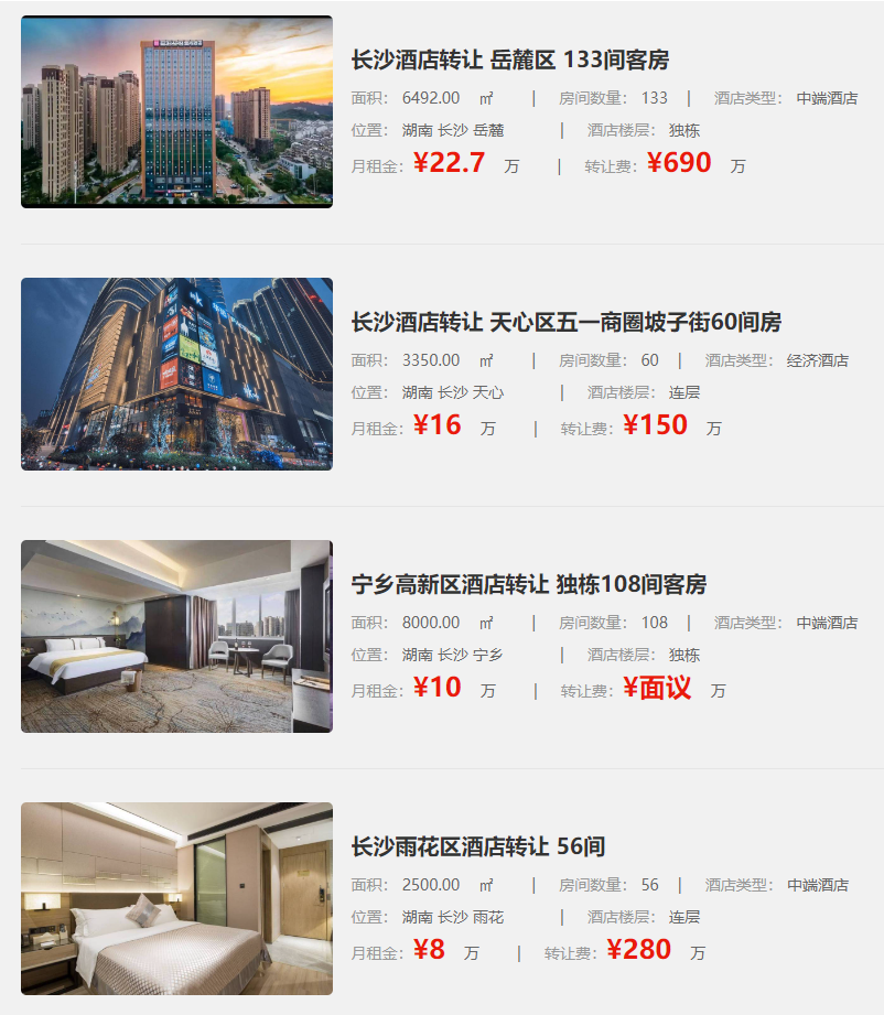 從轉(zhuǎn)讓酒店分布區(qū)域來(lái)看,涵蓋了雨花、天心、岳麓、芙蓉、望城、長(zhǎng)沙縣、寧鄉(xiāng)等多個(gè)區(qū)縣。不同區(qū)域的酒店各有特點(diǎn),在轉(zhuǎn)讓時(shí)也具有不同吸引力。比如位于雨花喜盈門旁的獨(dú)棟酒店,擁有 110 間客房,面積達(dá) 4500㎡;芙蓉區(qū)有高達(dá) 200 間客房的高端未評(píng)星酒店轉(zhuǎn)讓。